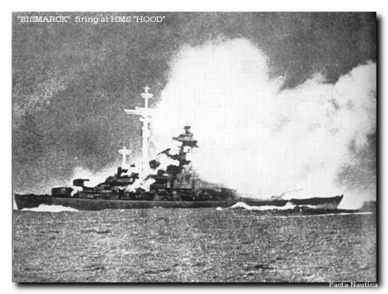 | Fotografia wykonana z pokładu krążownika PRINZ EUGEN, przedstawia niemiecki pancernik BISMARCK prowadzący ogień artyleryjski do brytyjskiego krążownika liniowego HMS HOOD. Foto: Fritz Bunsert. This picture shows the German battleship BISMARCK firing at the British battle cruiser HMS HOOD. Photo: Fritz Bunsert. |