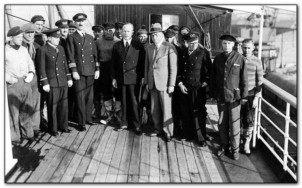U góry: Wspólne zdjęcie załóg s/s KOŚCIUSZKO i trawlera HORST WESSEL, wykonane w porcie gdyńskim 16 listopada 1933 roku.
