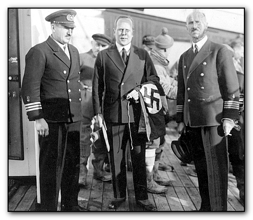 Z prawej: Niemiecki konsul von Hoops (w środku) z banderą s/s HORST WESSEL.