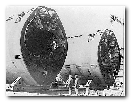 Sekcje U-Bootów typu XXI na pochylni stoczni gotowe do montażu.