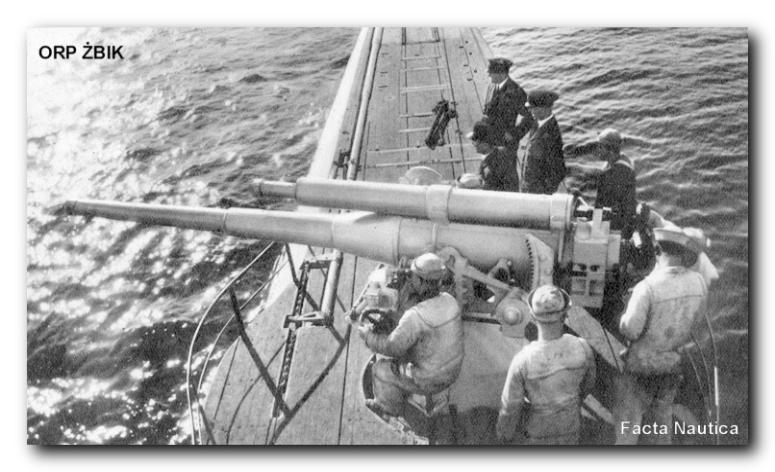 | ORP ŻBIK. Fotografia z 1936 roku przedstawia działo pokładowe kalibru 100 mm/L40. The Polish minelayer submarine ORP ŻBIK. When ORP ŻBIK was commissioned in 1932, she originally carried one 100 mm, 40-caliber deck gun and one 40 mm gun. In 1935, her deck 40-mm was replaced by two 13.7-mm (Hotchkiss) antiaircraft machine guns. |