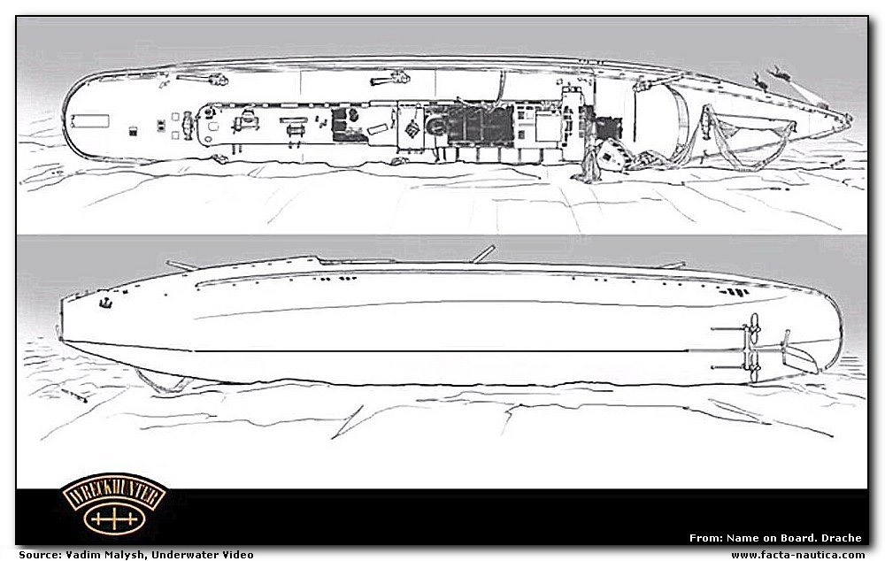Położenie wraku DRACHE na dnie Bałtyku - kadr z filmu "Name on Board. Drache" (źródło: Vadim Malysh, Underwater Video).