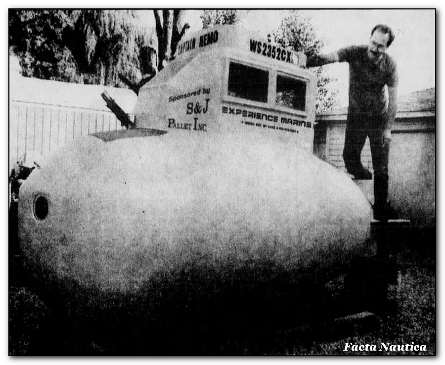 -----Domorosły konstruktur, nie mający żadnego doświadczenia szkutniczego, zaprojektował i wykonał samodzielnie z żywicy i drewna pojazd podwodny o długości 13 stóp (około 4 metrów). Realizacja tego przedsięwzięcia trwała dwa lata i pochłonęła około 8000 dolarów.