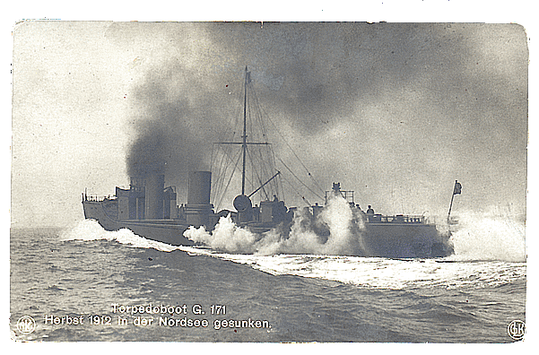 | Niemiecki torpedowiec G.171 na starej pocztówce. Rok wydania nieznany. Wydawca: Gebr. Lempe, Kiel. Ze zbiorów autora. |