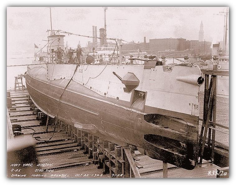 | USS S-25, późniejszy ORP JASTRZĄB, widziany od strony dziobu. Zdjęcie wykonane 22 października 1923 roku w stoczni marynarki USA w Bostonie. |