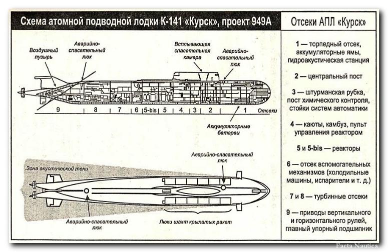 | Schemat budowy K-121 KURSK. The internal layout of the nuclear submarine K-141 KURSK. Source: M.Yu. Kurushin "Podvodnaya lodka Kursk", Moscow, 2000. |