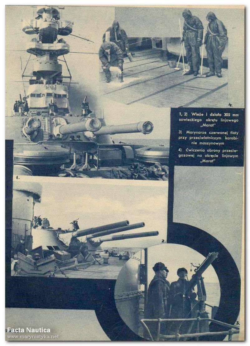 W lipcowym numerze miesięcznika MORZE z roku 1936 zamieszczono interesujący fotoreportaż z pokładu radzieckiego pancernika MARAT, który dwa lata wcześniej przebywał z wizytą w Gdyni. Warto zwrócić uwagę na fotografię numer 4. Przedstawia ona marynarzy w kombinezonach ochronnych i maskach przeciwgazowych, demonstrujących ćwiczenia obrony przeciwgazowej. Wydaje mi się, że warto w tym miejscu wspomnieć podobne testy, jakie w 1923 roku prowadziła Royal Navy na krążownikach liniowych HMS HOOD i HMS REPULSE. Autorem tego tekstu, cytowanego niżej, jest Tadeusz Klimczyk (1992);