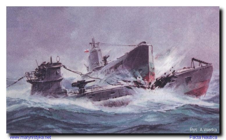 Tak wyobrażał sobie Adam Werka staranowanie U-Boota przez ORP WILK. Niestety, wszystko wskazuje na to, że zatopioną 20 czerwca 1940 roku przez Polaków jednostką był holenderski okręt podwodny O-13 ...