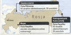 Rosyjskie okręty o napędzie nuklearnym należą do dwóch flot: Północnej z główną bazą w Siewieromorsku i Pacyfiku z bazą w Pietropawłowsku Kamczatskim. Do tej pory zdemontowano 90 wycofanych ze służby okrętów Floty Północnej i 43 jednostki Floty Pacyfiku. Do rozbiórki pozostały jeszcze 64. Największym problemem są znajdujące się w nich materiały radioaktywne, których liczbę szacuje się na 150 tys. ton. Przewożone są one do ośrodka odzyskiwania paliwa nuklearnego w miejscowości Majak w południowym Uralu. Kliknij obrazek, aby powiększyć.