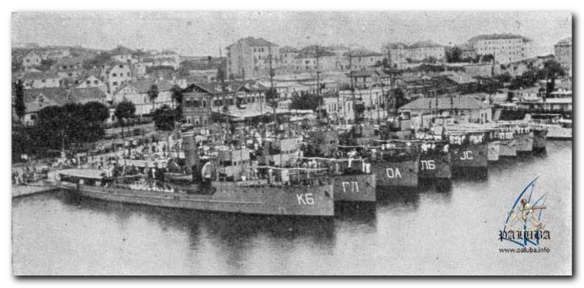 Jugosłowiańskie stawiacze min w Splicie: KOBAC, GALEB, ORAO, LABUD i JASTREB. W głębi stoją niezidentyfikowane torpedowce. Źródło: www.paluba.info.
