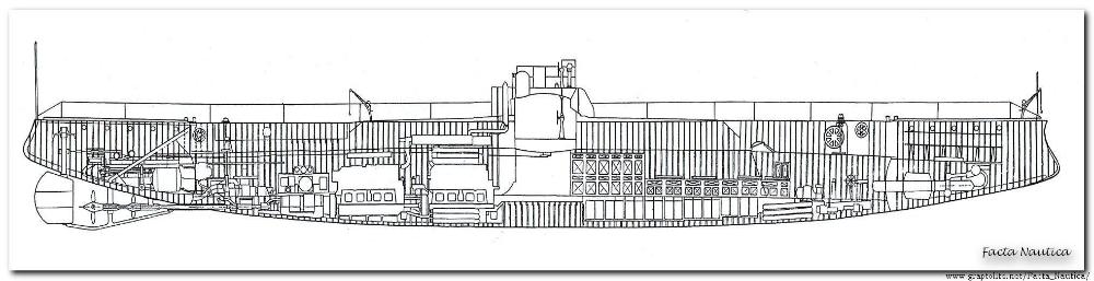 Okręt podwodny AKUŁA - przekrój podłużny [ źródło ]. Kliknij ilustrację, aby powiększyć ją.