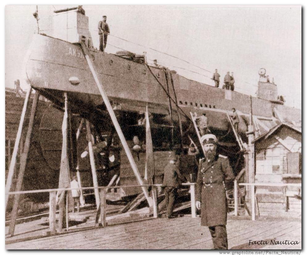 Okręt podwodny AKUŁA w stoczni - widoczne trzy nastawne śruby napędowe. Na pierwszym planie konstruktor, Iwan G. Bubnow. General I.G. Bubnov, who would be responsible for most Russian submarine design until the Revolution, stands in front of the AKULA's stern, under costruction at the Baltic Works. Visible are the submarine's three propellers, a feature forces on Bubnov, because of the unavaillability of large diesel engines to permit the use of only two shafts.*