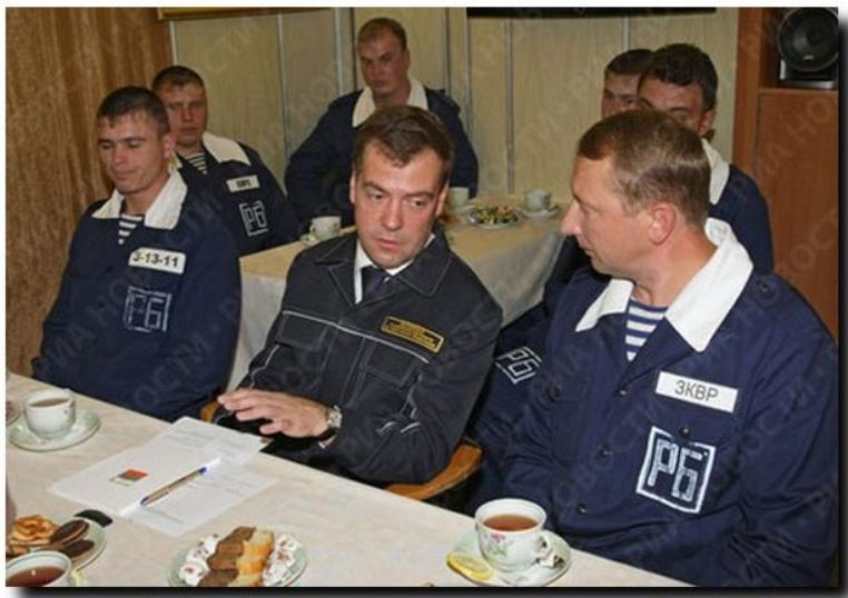 Prezydent Dmitrij Miedwiediew na koniec swojej wizyty ugoszczony został przez załogę filiżanką herbaty i ciastkami. W trakcie tego spotkania, przebiegającego w serdecznej, wręcz familijnej atmosferze, zapewnił marynarzy, że mimo kryzysu gospodarczego wydatki na cele obronne nie zostaną zmniejszone. Zaznaczył, że Rosja musi nadal budować nowe okręty podwodne i modernizować siły zbrojne.