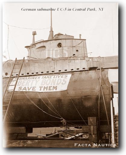 Niemiecki podwodny stawiacz min UC-5 w Central Parku (New York) przed ceremonią przemianowania na U-BUY-A-BOND. The German submarine minelayer UC-5 in Central Park (New York).