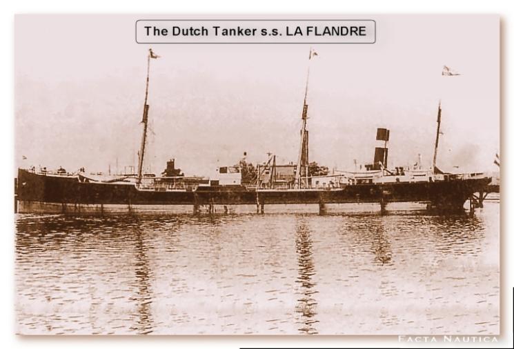 Holenderski zbiornikowiec s.s. LA FLANDRE zatonął 21 lutego 1916 na minie postawionej przez U-Boota UC-5. The Dutch tanker s.s. LA FLANDRE struck a mine laid by the German U-boat UC-5 and sank near the Galloper lightship 2 minutes later on February 21st, 1916. Two survivors were picked up by the British vessel s.s. OUSEL; 29 dead.