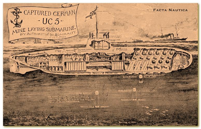 | Schemat budowy niemieckiego podwodnego stawiacza min UC-5, reprezentanta typu UC-I. Angielska pocztówka propagandowa z czasów I wojny światowej. The German Type UC-I submarine minelayer UC-5. British propaganda postcard (issued 1916). |
