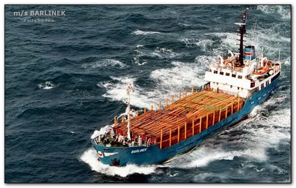 ---------"Przygody m/s BARLINEK: Kiedyś trafił na sztormową pogodę i o mało co nie poszedłby na dno. Ładunek tarcicy przesunął się i statek znalazł się w ogromnym niebezpieczeństwie, pozostając w 30 stopniowym przechyle. Podjęto decyzję o zrzuceniu ładunku pokładowego, co uchroniło statek przed pewnym zatonięciem. Była to tzw. awaria wspólna, czyli nadzwyczajna sytuacja, w której przewoźnik morski świadomie i rozsądnie ponosi koszty w celu uratowania statku przed grożącym niebezpieczeństwem. Innym razem przewoził blindziarza, o którym załoga dowiedziała się, gdy ten opuścił angielski port."