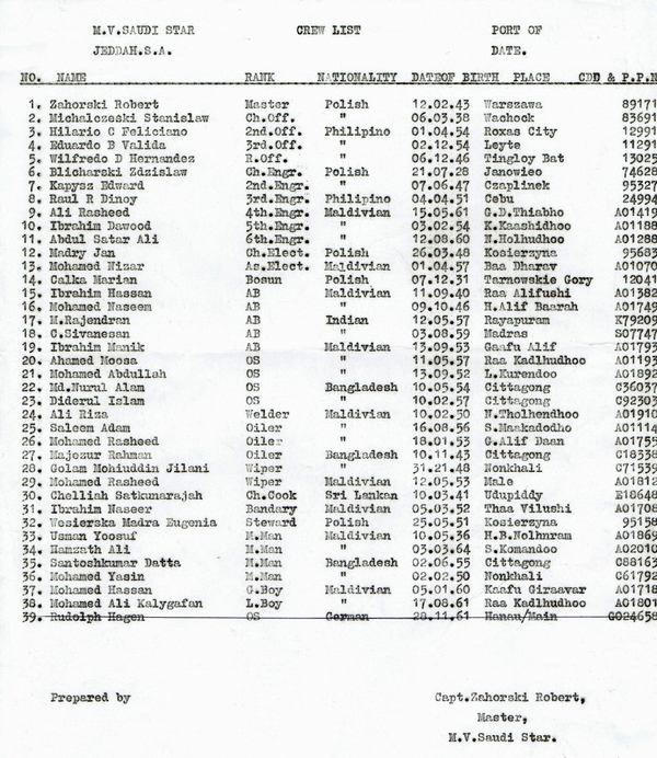 ---------Statek pływał na linii z Europy, przez porty Morza Śródziemnego, czasem Bałtyk, zawsze Jeddah i do Indii. Woził drobnicę, drewno ze Szwecji i inne całkiem opłacalne ładunki. Statek był mocno zaniedbany i brudny. Załoga wielonarodowa. Poza kilkoma Polakami, mną, I oficerem, I i II mechanikami, bosmanem i elektrykiem byli jeszcze oficerowie Filipińczycy, marynarze z Malediwów, kilku Hindusów, Cejlończyków, z którymi był problem, bo miałem zarówno Syngalezów jak i Tamilów, więc musiałem pilnować, aby się nie pozabijali. Razem z 8 narodowości. Załoga liczyła prawie 60 osób. Dzisiaj nie do pomyślenia. Malediwski starszy marynarz zarabiał 165 dolarów miesięcznie, filipiński oficer około 400. Byli tani, więc było ich dużo. My Polacy byliśmy tam arystokracją zarobkową, mając normalne wynagrodzenie, ale było pewne „ale”. Armator zalegał z płatnościami i zwykle zalegał za 2-3 miesiące. W czasie wyokrętowania i pieniądze te zwykle przepadały, natomiast Polservice ściągał z nich swój haracz.