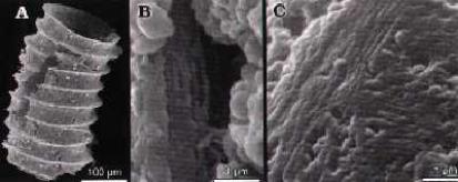 | SEM micrographs of Rhabdopleura kozlowskii from Callovian (Jurassic), Lapiguz clay pit, Lukow (Poland). A. Fragment of a zooidal tube. B. Fissure in the periderm; arrow indicates a presumably bunch of cortical fibrils. C. Unconformity between two presumably bunches of cortical fibrils on the surface of a sterile bud cyst. Note a striking similarity to cortical bandages in graptolites! From Mierzejewski & Kulicki, 2001. |