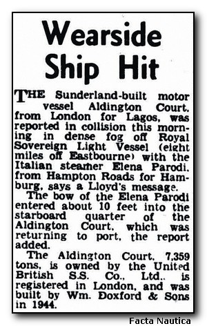 Informacji o kolizji statków ELENA PARODI i ALDINGTON COURT w kanale La Manche. Wycinek z "The Sunderland Echo".