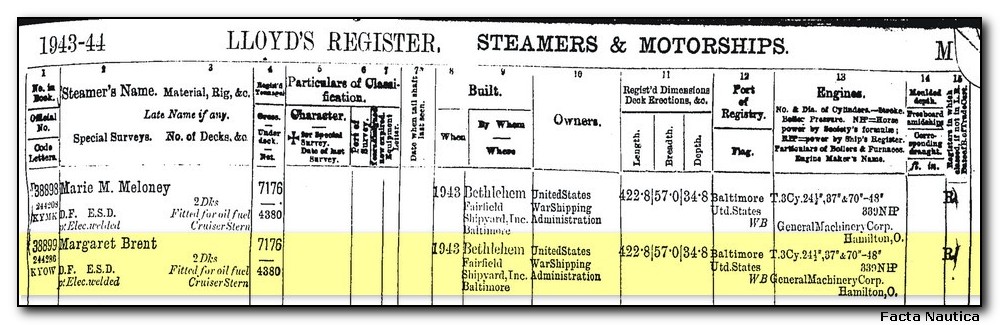 Statek s/s MARGARET BRENT (późniejsza KOPALNIA KAZIMIERZ) pojawił się w Rejestrze Lloyda w edycji 1943-44.