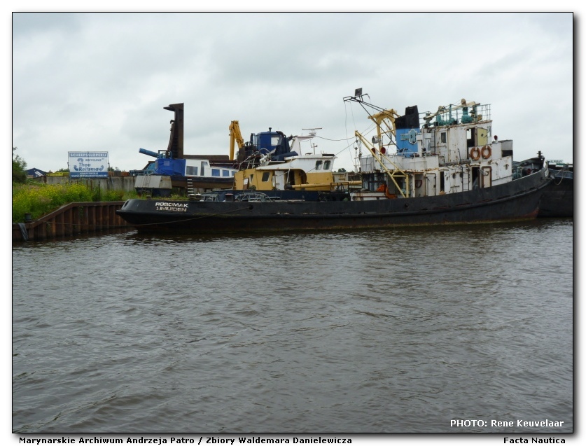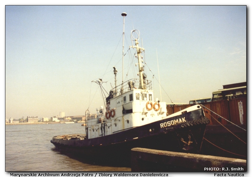 ---------Dalsze losy jednostki prześledził Andrzej Patro: W maju 1991 holownik zmienił właściciela, stał się nim obywatel brytyjski R. Atkin, który następnie przekazał go holenderskiemu armatorowi R.E Ditmar z Ijmujden. Udało się nam potwierdzić informację, że ROSOMAK cumował w Greenwich w październiku 1991. Na zdjęciu Roberta J. Smitha z 21.10.1991 r. widać ten holownik pod niezmienioną nazwą i znakiem armatora PRO na kominie. Tę informację potwierdza wpis Waldemara Danielewicza na jednym z forów internetowych: "Jeżeli chodzi o holownik ROSOMAK to pływał on w barwach PRO w latach 1958- 1991. Konkretnie w maju 1991 r. został sprzedany w Rotterdamie Brytyjczykowi R. Atkinowi ". Jak i kiedy ten holownik ( powtórnie? ) trafił do Holandii i czy był ekploatowany w Anglii lub Holandii tego nam nie udało sie ustalić. Na tej stronie prezentujemy kilka zdjęć rdzewiejącego ROSOMAKA w Kootstertille i Ijmujden ( Holandia ) pod różnymi nazwami. Ostatnie autorskie zdjęcie ROSOMAKA Rene Keuvelaara z Ijmujden datowane jest na 13.06.2011.